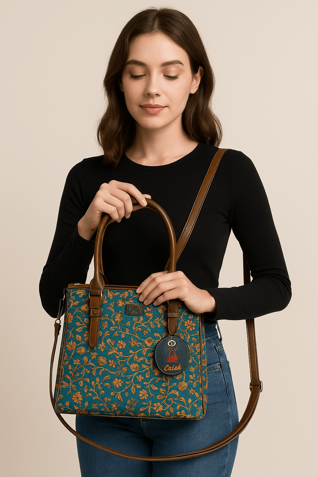 Introducing our Ethnic Motifs Printed Structured Designer Hand Bag! This stunning handbag features vibrant floral patterns in shades of orange, green, and brown against a teal background. The brown leather handles and trim add a touch of elegance. With side zippers for extra storage, it’s as practical as it is beautiful. Perfect for adding a splash of color and sophistication to your outfit, whether for casual outings or special occasions.
