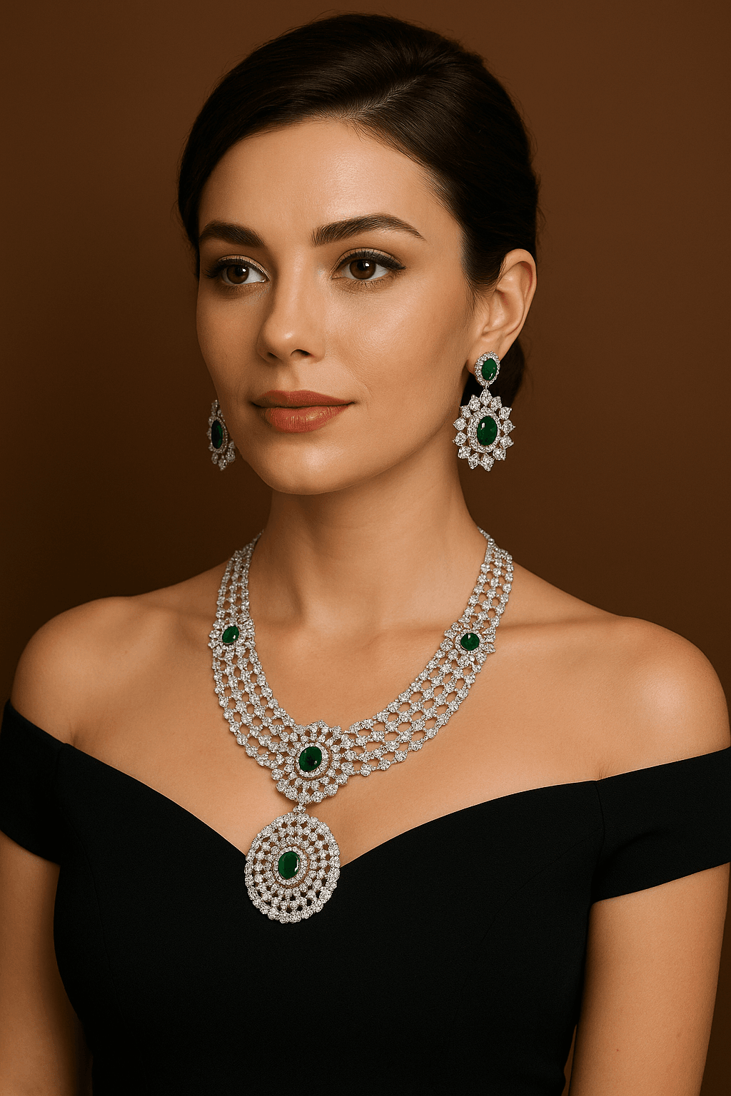 Elevate your ethnic and party look with this Rhodium Plated CZ Emerald Studded Diamond Necklace Set, beautifully crafted with shimmering cubic zirconia and vibrant emerald-green stones. The necklace features an elegant layered design with intricate floral patterns and a large central pendant that adds royal charm. Paired with matching earrings, this jewelry set is ideal for weddings, festive occasions, and special events. Its rhodium plating ensures a brilliant silver shine and long-lasting finish, making it a perfect blend of traditional and modern elegance.